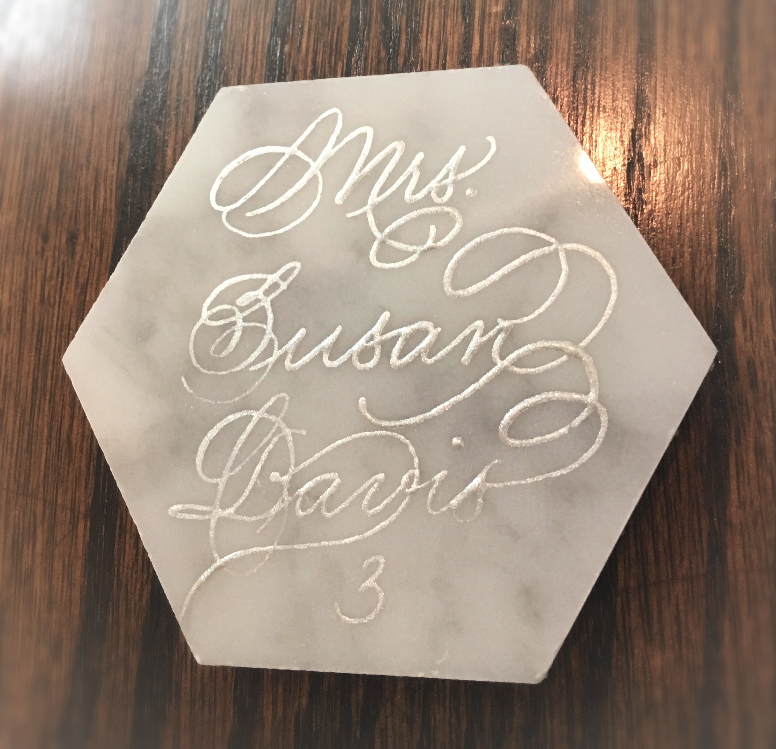 Who doesn't love Italian white marble with gold calligraphy? I have no idea. I just adore hand lettering on marble tiles right now. These were for an event in New York and this client chose my ornate Bella Grafia hand-calligraphed script. I also created a few with silver ink which honestly on initial thought, I questioned the idea based on visibility. I LOVE it when my clients prove me wrong and it turns out beautifully. The 2nd pic is the result of silver ink on the white marble tile. The subtle combination of silver ink on white screams for all lesser colors to bow down. ADORE!!!